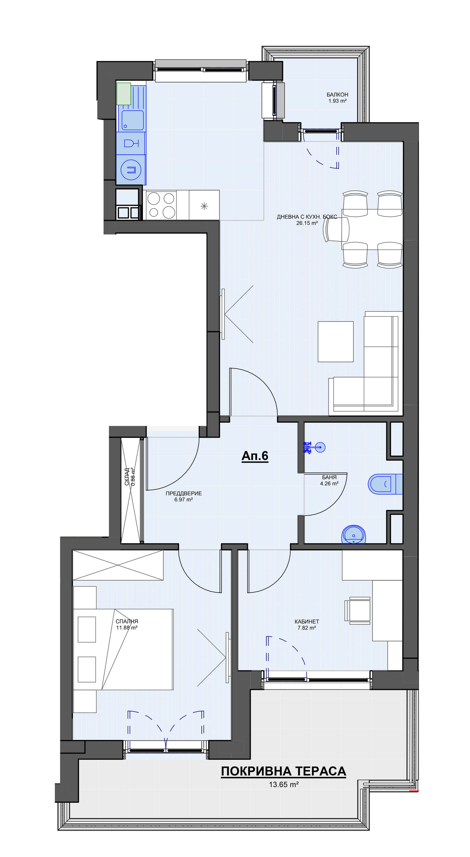 Тристаен апартамент с дневна с кухненски бокс, спалня, кабинет, баня с тоалетна, склад, предверие, балкон и тераса. Апартамента е с Обща площ 86,42 кв.м, което включва чиста площ 72,60 кв.м, общи части и покривна тераса 13,65 кв.м.
